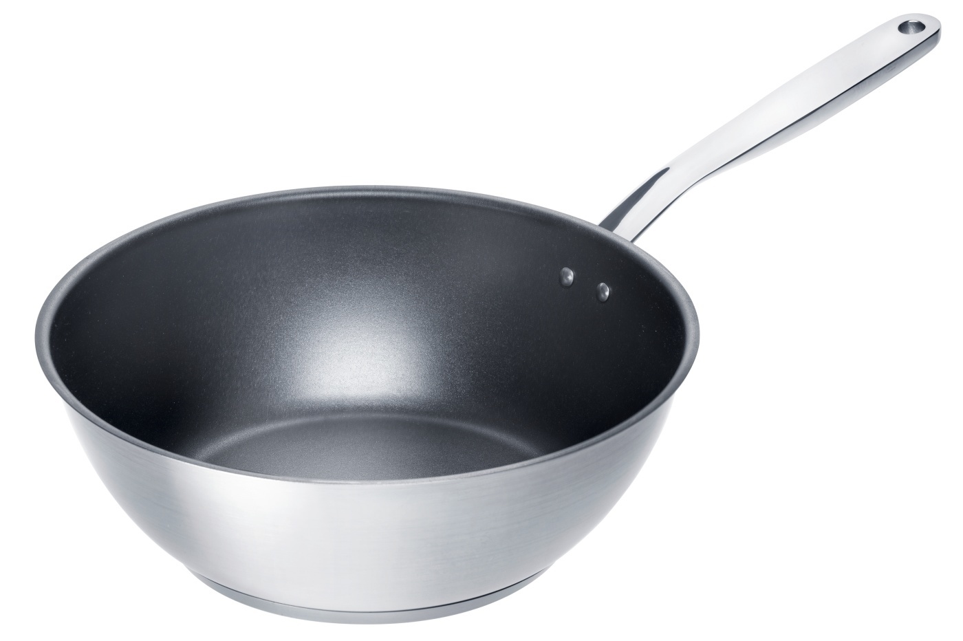 Сковорода Wok из матовой нержавеющей стали с высококачественным антипригарным покрытием Емкость 2 литра Диаметр 28 см - вверху, 14.7 см - днище Возможное применение: панели индукционных и HiLight конфорок Страна происхождения: Финляндия