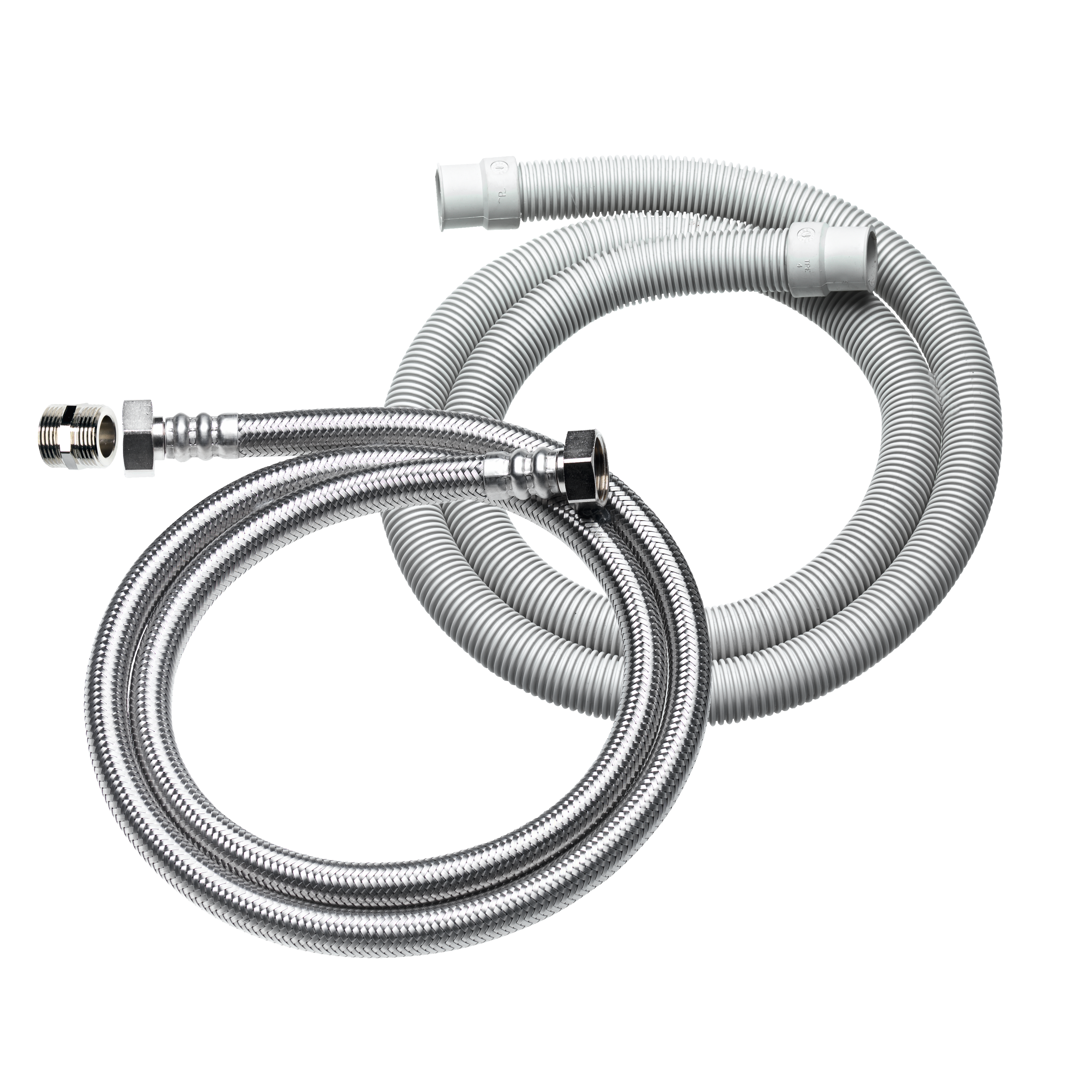 В комплекте: гибкая подводка, сливной шланг и 2 хомута.