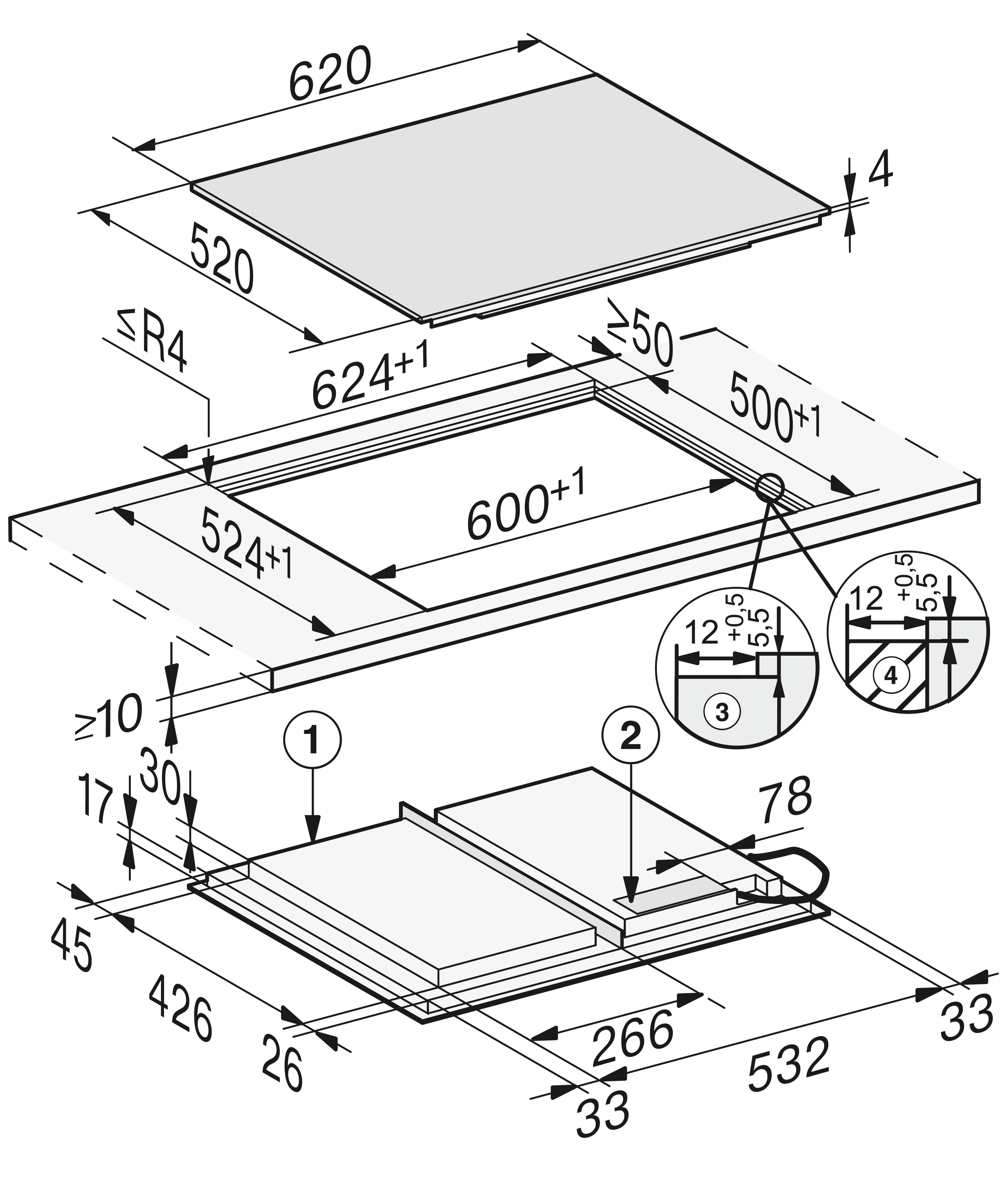 Внутренние размеры выреза в мм (ширина) для встраивания заподлицо