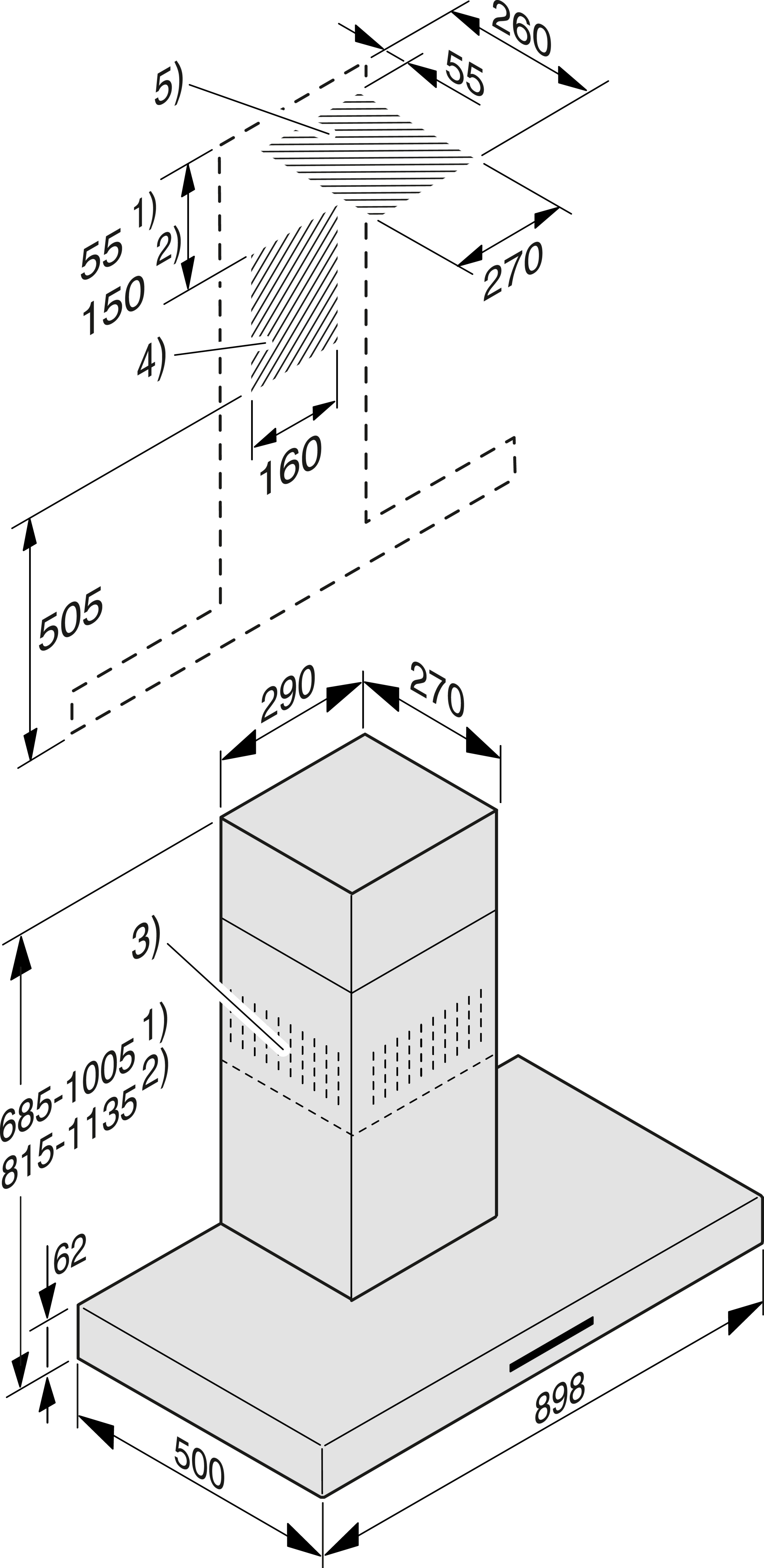 Общая высота вытяжки для режимов отвода воздуха и отвода с выносным вентилятором минимально (мм)