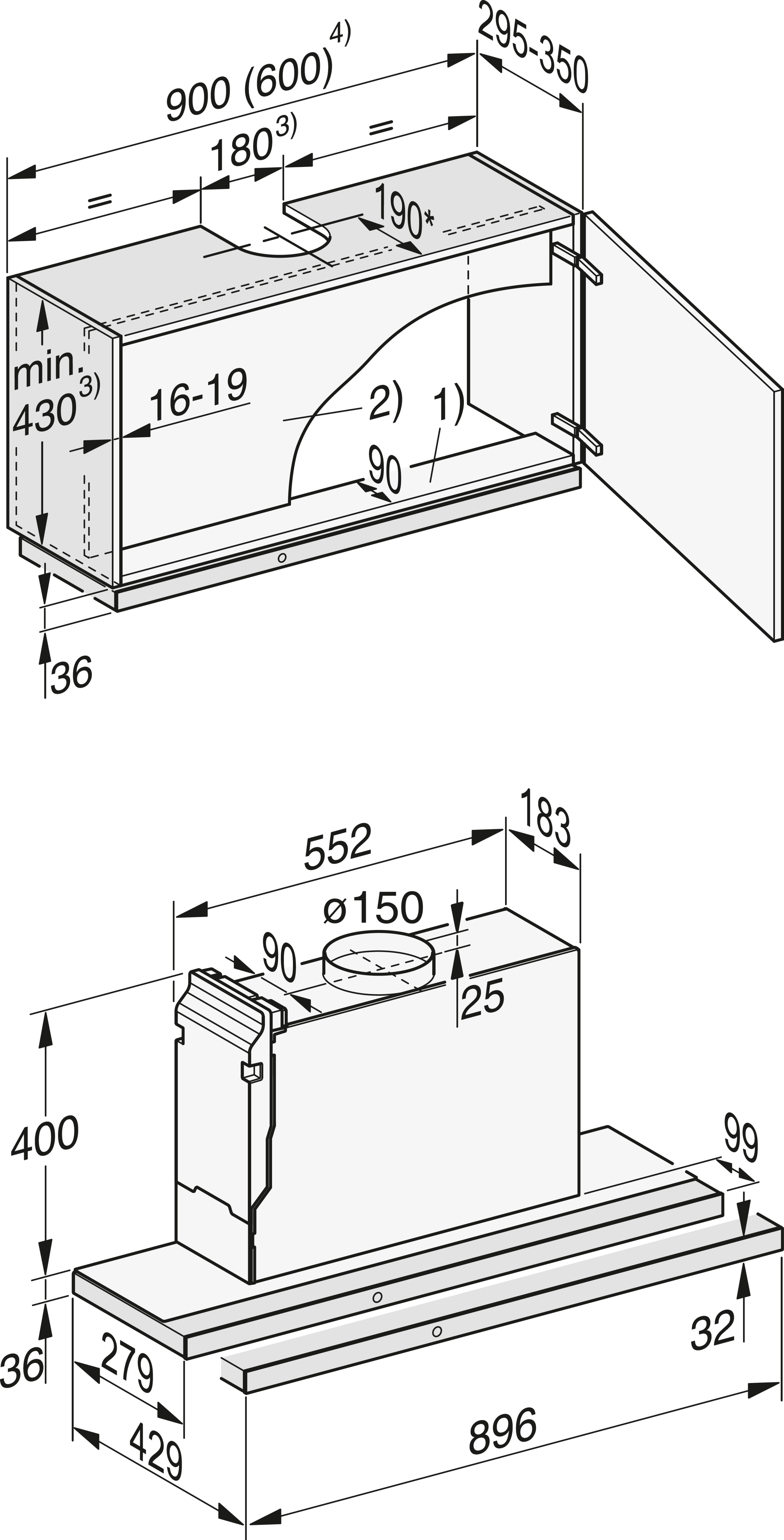 Минимальное безопасное расстояние над панелью газовых конфорок (общая мощность макс. 12,6 кВт, горелки ≤ 4,5 кВт), мм