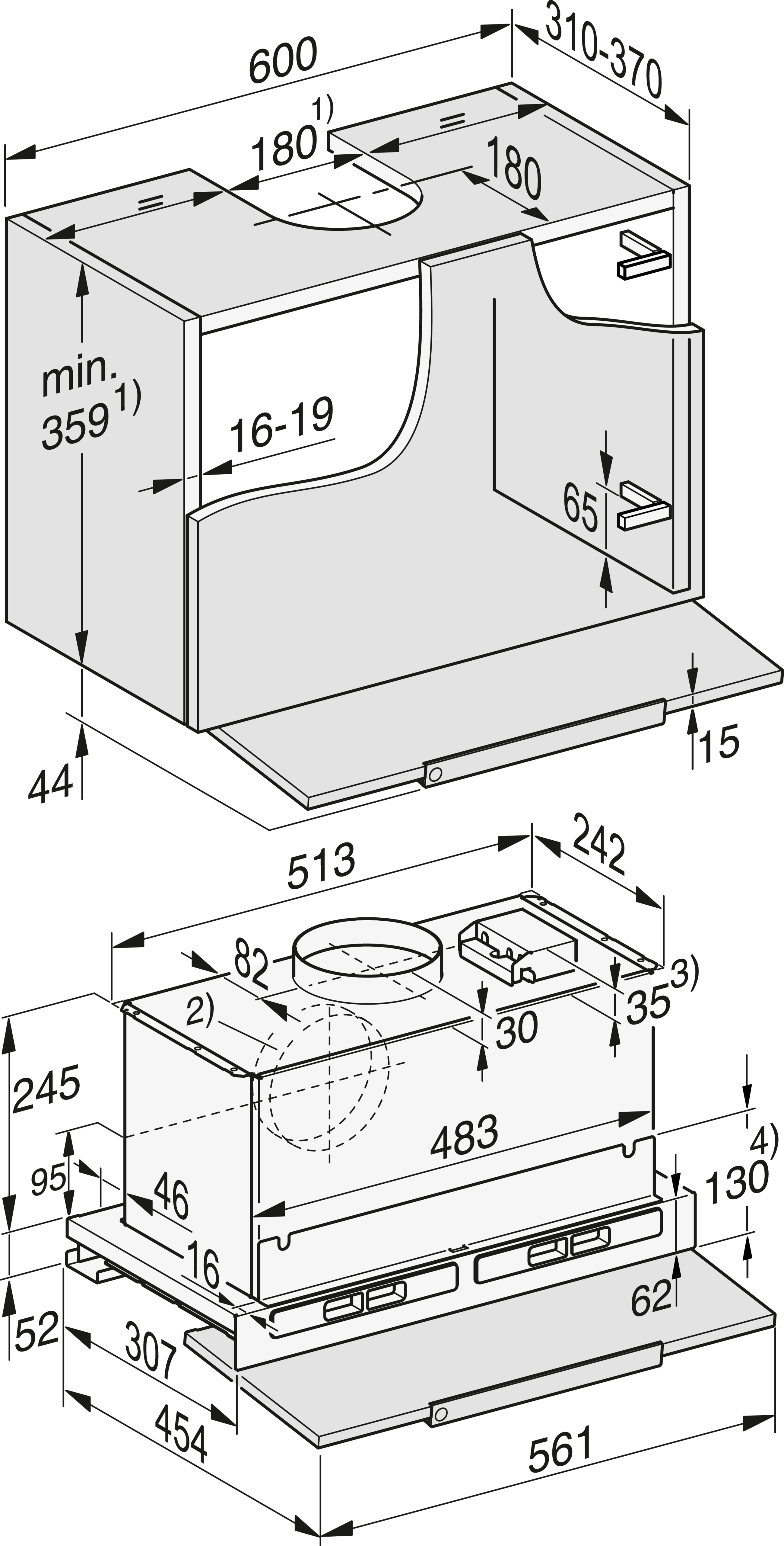 Минимальное безопасное расстояние над панелью газовых конфорок (общая мощность макс. 12,6 кВт, горелки ≤ 4,5 кВт), мм