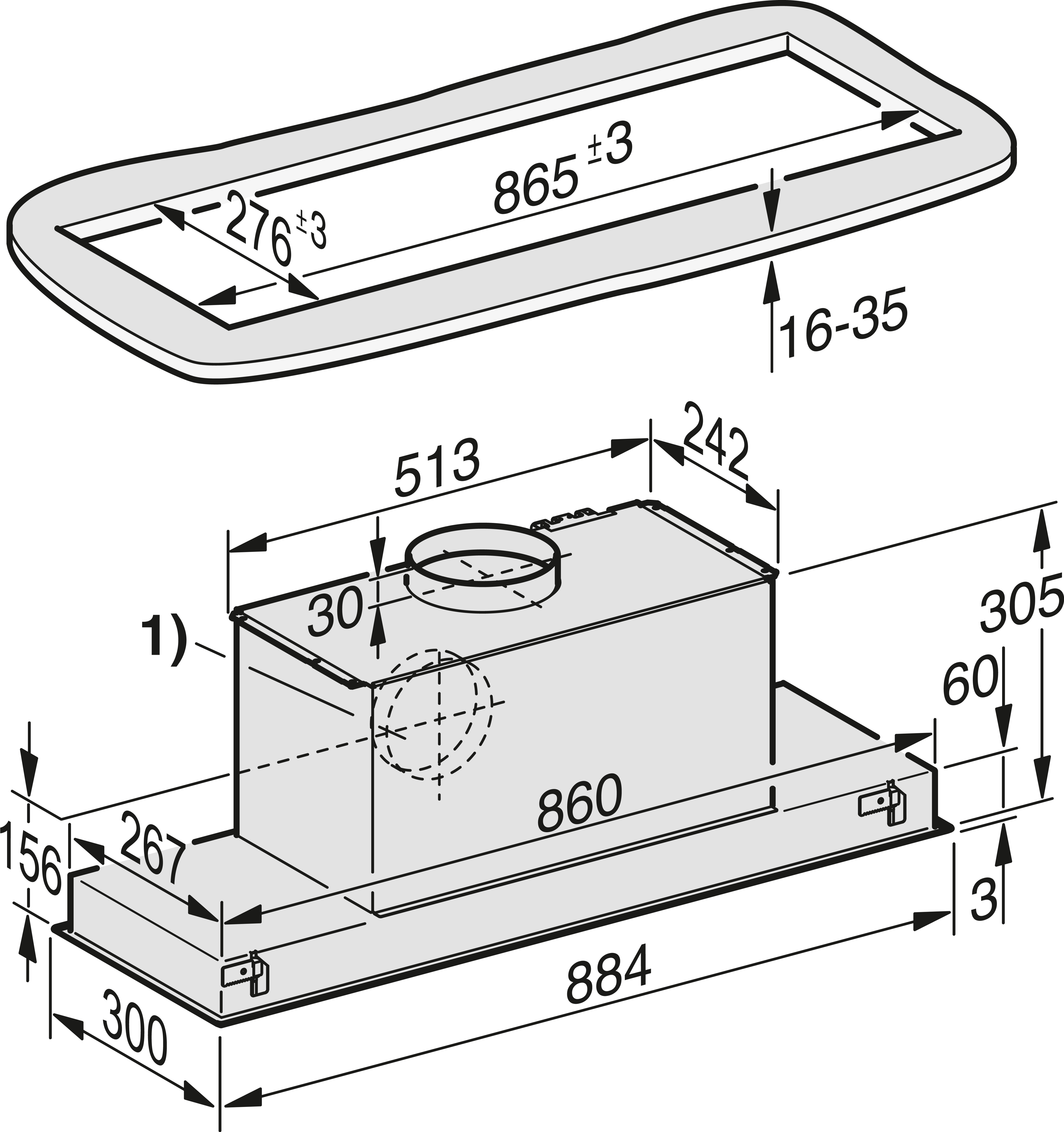 Минимальное безопасное расстояние над панелью газовых конфорок (общая мощность макс. 12,6 кВт, горелки ≤ 4,5 кВт), мм