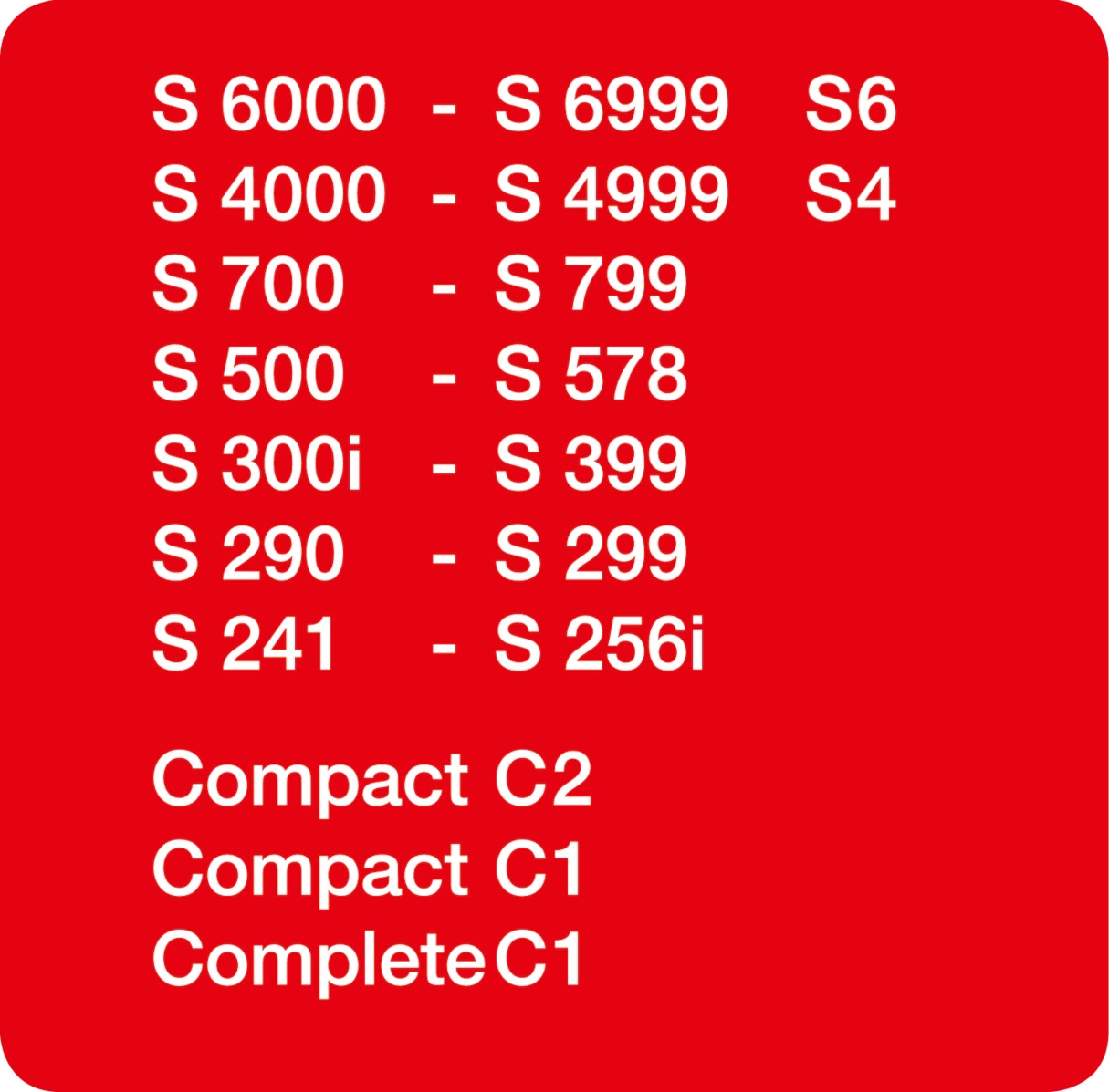 S6, S4, S700-S799, S500-S578, S300i-S399, S290-S299, S241-S256i, Compact C2, Compact C1, Complete C1